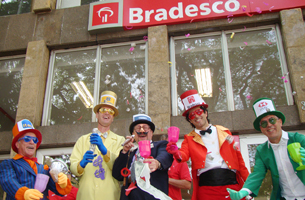 Diretores do Sindicato dos Bancários de Londrina e Região saíram às ruas na manhã do dia 16/09 para denunciar a “farra dos banqueiros”. Na atividade realizada no início do Calçadão, em frente à agência Centro do Bradesco, quatro “banqueiros” brindavam seus lucros tranquilamente, deixando de lado as reivindicações da Campanha Nacional Unificada da categoria.