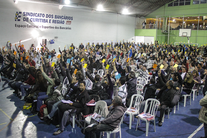 Mais de 600 trabalhadores bancários participaram da assembleia geral, convocada pelo Sindicato dos Bancários de Curitiba e região, nesta quarta-feira, 26 de setembro, de apreciação e deliberação sobre as propostas apresentadas pela Federação Nacional dos Bancos (Fenaban), pelo Banco do Brasil e pela Caixa Econômica Federal.