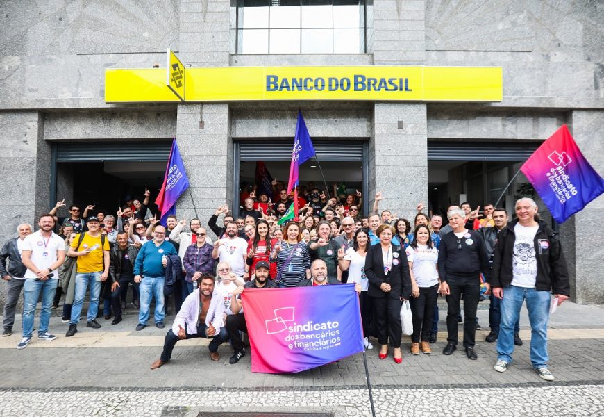 Diante das reiteradas ameaças de privatização dos bancos e empresas públicas brasileiras, o Sindicato dos Bancários e Financiários de Curitiba e região está mobilizado para defender a soberania nacional e dialogar com a população sobre os riscos de uma possível venda (total ou parcial) do Banco do Brasil e da Caixa Econômica Federal. Na última terça-feira, 11 de outubro, a entidade realizou um ato no Centro da capital, em defesa dos bancos públicos e contra a privatização.