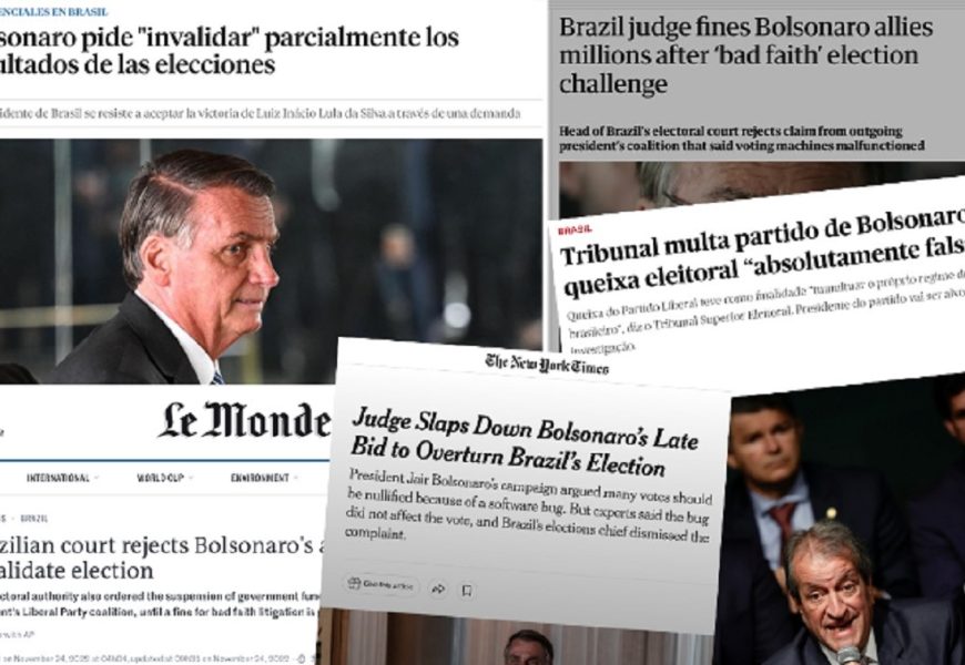 As agências internacionais de notícias também destacam a manobra infundada do presidente derrotado. Na Reuters: Tribunal Eleitoral do Brasil rejeita contestação eleitoral de Bolsonaro. “O chefe do TSE, Alexandre de Moraes, rejeitou uma reclamação dos aliados do presidente Jair Bolsonaro para contestar a eleição presidencial, que o titular perdeu por uma pequena margem, de acordo com um documento judicial”, diz.