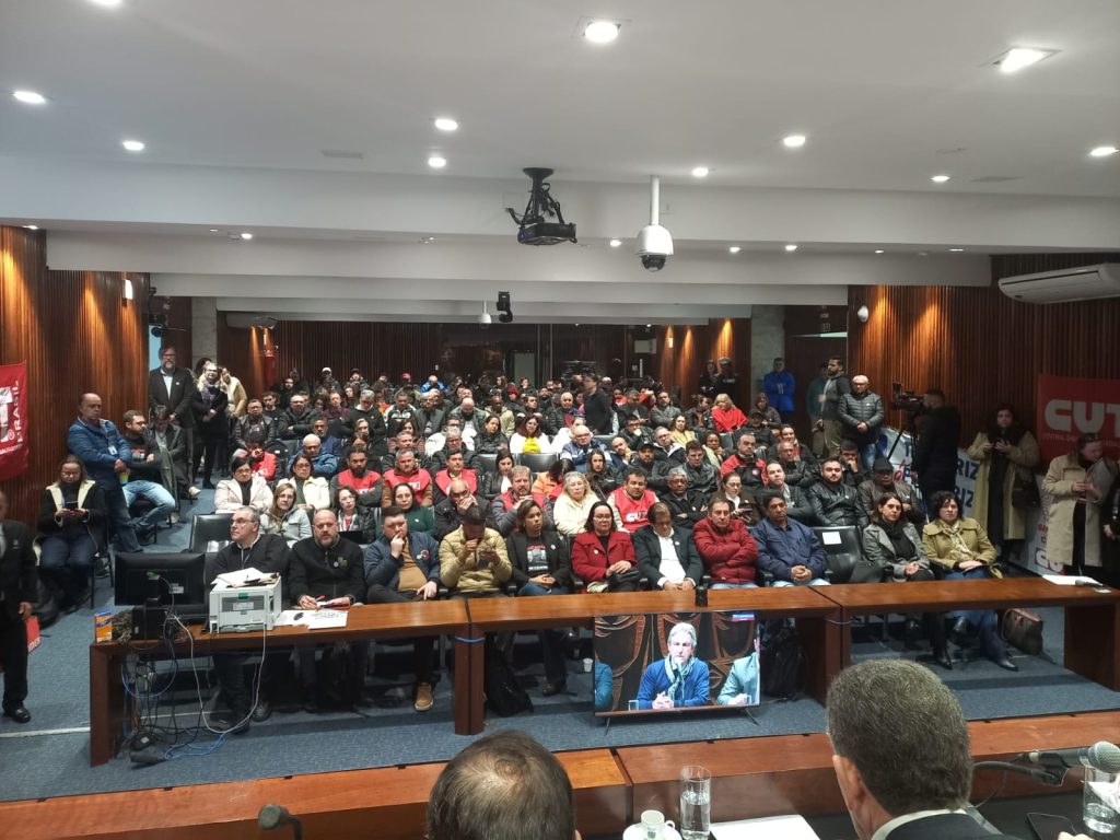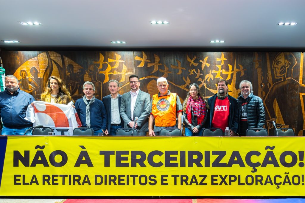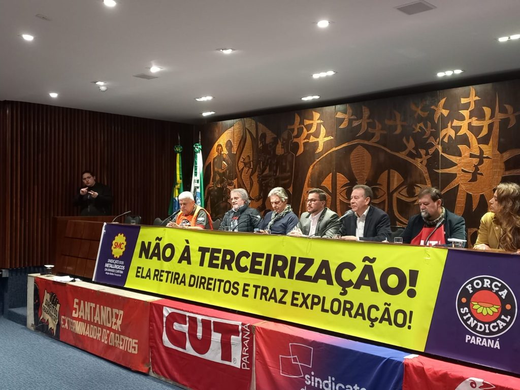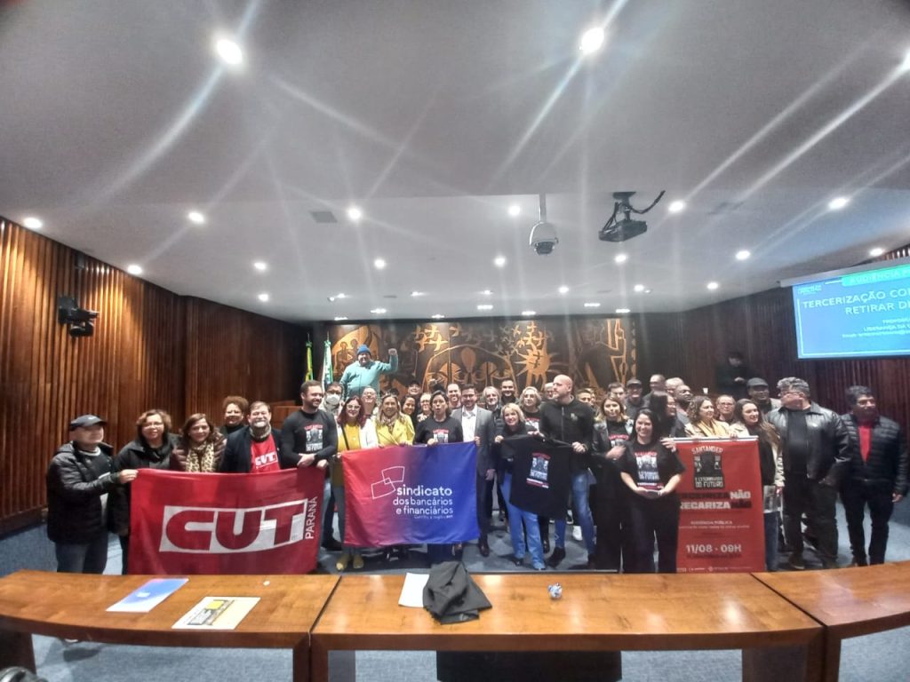 Representantes da Federação dos Trabalhadores em Empresas de Crédito do Paraná (Fetec-CUT/PR) e de seus 10 sindicatos filiados (Curitiba, Apucarana, Arapoti, Campo Mourão, Cornélio Procópio, Guarapuava, Londrina, Paranavaí, Toledo e Umuarama) estiveram presentes na manhã desta segunda-feira (11), na Assembleia Legislativa do Paraná (Alep-PR), para participar de uma audiência pública cujo tema foi “Terceirização como forma de retirar direitos”. O debate foi uma iniciativa do deputado estadual Arilson Chiorato (PT) e lotou o plenarinho da assembleia.