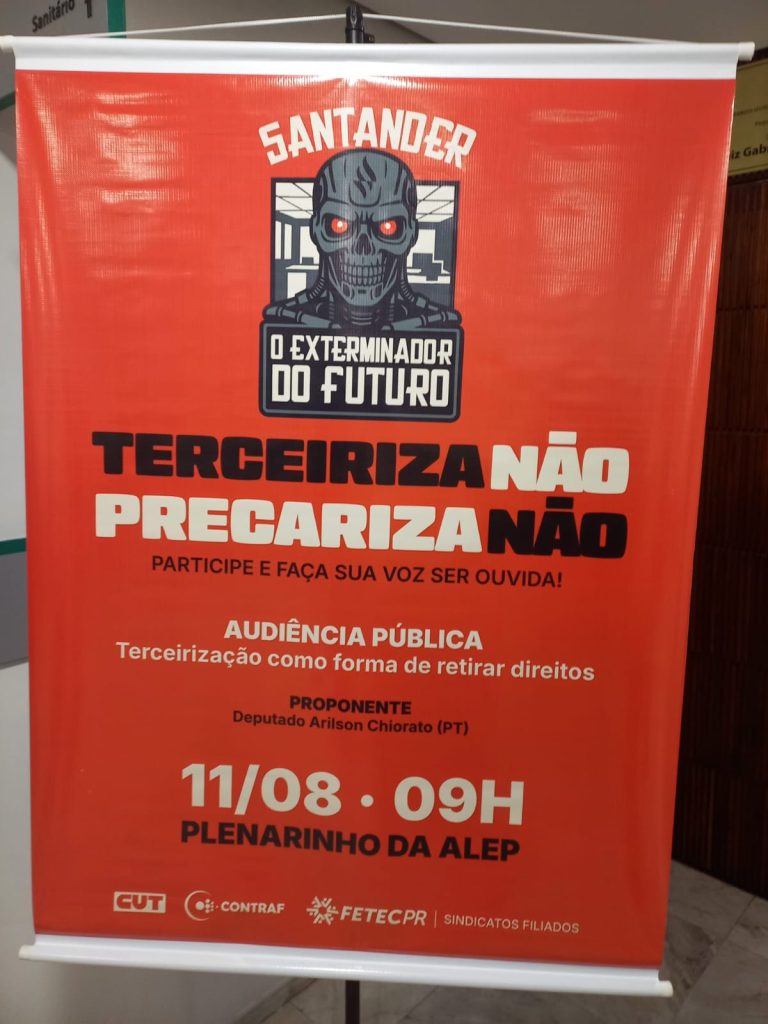 O presidente do Sindicato dos Bancários de Campo Mourão, Bruno Murante da Silva, também faz críticas sobre o método de terceirização realizado pelo Santander. “A terceirização tem sido utilizada por diversas empresas como forma de desmantelar os direitos dos trabalhadores, eliminar a sua representatividade, entre outros pontos. O Santander tem criado novos CNPJs para descaracterizar o trabalho do bancário, fazendo, com isso, que eles sejam transferidos para essas empresas que estão sendo criadas como forma de tirá-los da categoria bancária, perdendo diversos direitos, direitos históricos conquistados pela luta sindical. Então o Santander vem agredindo de forma muito dura os trabalhadores”, aponta.