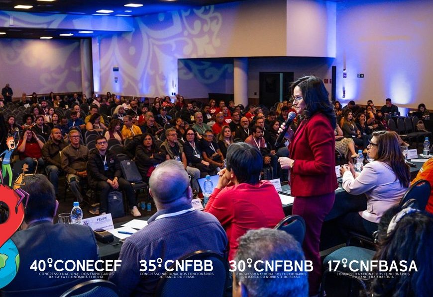 “Este é um momento de reafirmar essa unidade, que não é só dos bancários e das bancárias, é de toda a classe trabalhadora. Por isso, abrimos o nosso congresso reafirmando nosso compromisso inegociável com o povo brasileiro, na defesa dos bancos públicos, das empresas públicas, na defesa da Democracia, na defesa de nossa soberania”, continuou a dirigente.