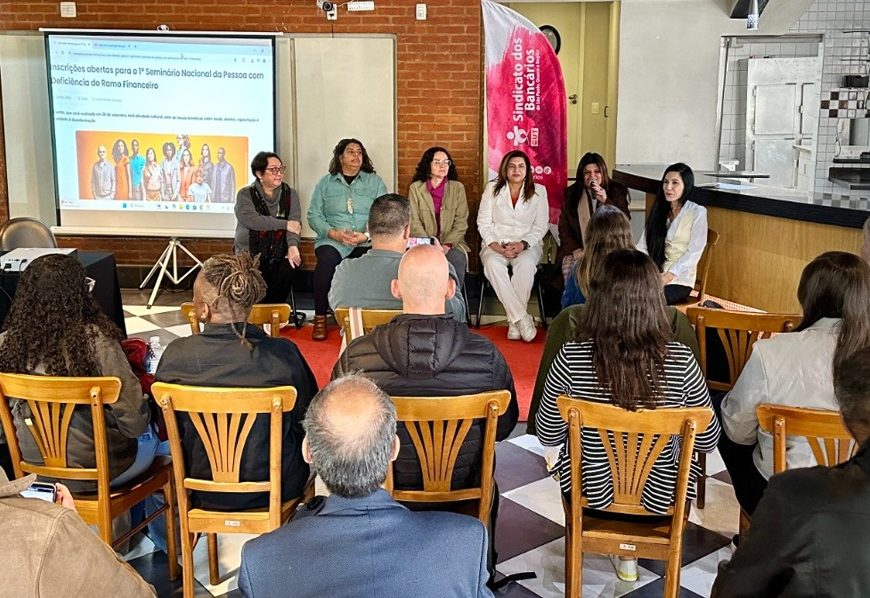 O movimento sindical bancário deu um passo histórico nesta sexta-feira (26), com a realização do 1º Seminário Nacional da Pessoa com Deficiência do Ramo Financeiro, no Café dos Bancários, em São Paulo. O evento reuniu dirigentes sindicais, parlamentares, especialistas e representantes da sociedade civil para debater saúde, esporte, representatividade, educação inclusiva, direitos e enfrentamento à desinformação sobre as pessoas com deficiência.
