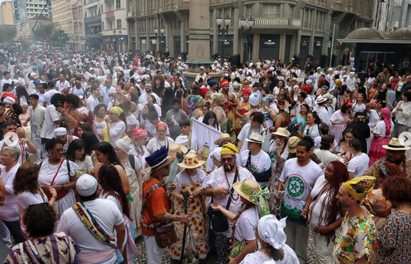 A caminhada começou com um ato religioso na Praça Tiradentes, conduzido por lideranças espirituais de diferentes tradições afro-indígenas, com saudações a diversas divindades. Em seguida, o cortejo seguiu pela Rua Alfredo Bufren até a Praça Santos Andrade, onde acontece o ato “A Revolta dos Atabaques” — uma intervenção sonora e política de enfrentamento ao silenciamento dos terreiros.