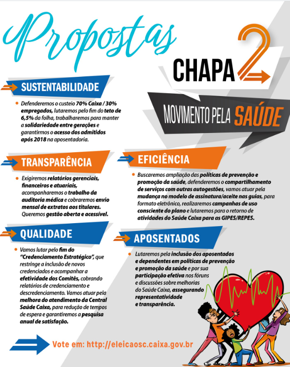 “Nosso plano é de autogestão. O Conselho de Usuários é fundamental para defender o Saúde Caixa e garantir sua qualidade e sustentabilidade, assim como sua manutenção para todas empregadas e empregados após a aposentadoria. Por isso, é importante que todos votem para elegermos uma chapa preparada e com histórico de luta em defesa dos interesses das empregadas e empregados da ativa e aposentados”, disse o coordenador da Comissão Executiva dos Empregados (CEE) da Caixa, Felipe Pacheco, ao explicar que o Conselho de Usuários é um órgão autônomo de caráter consultivo, criado com a finalidade de oferecer subsídios para que a Caixa aperfeiçoe a gestão do plano. “Apoiamos a Chapa 2 – Movimento Pela Saúde pois seus membros já provaram, na prática que são capazes de lutar pelos interesses dos seus colegas de trabalho”, completou.