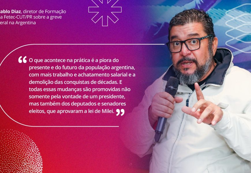 “O que acontece na prática é a piora do presente e do futuro da população argentina, com mais trabalho e achatamento salarial e a demolição das conquistas de décadas. E todas essas mudanças são promovidas não somente pela vontade de um presidente, mas também dos deputados e senadores eleitos, que aprovaram a lei de Milei”, explica Pablo Diaz, diretor de Formação da Fetec-CUT/PR.