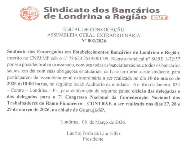 A Diretoria do Sindicato de Londrina vai realizar Assembleia Geral Extraordinária no dia 10 de março, a partir das 19h, no Auditório da Sede Administrativa, para eleger delegados e delegadas que irão representar a entidade no 7º Congresso Nacional da Contraf-CUT (Confederação Nacional dos Trabalhadores do Ramo Financeiro).