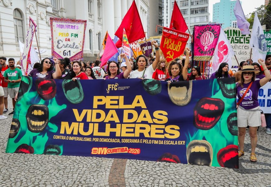 Mulheres da categoria bancária participaram, no último domingo, 8 de março, da marcha realizada em Curitiba pelo Dia Internacional das Mulheres. A presidenta do Sindicato, Cristiane Zacarias, foi uma das mulheres, entre outras presidentas de entidades, a abrir a marcha, que saiu da Praça Santos Andrade e percorreu a rua Marechal Deodoro, até retornar ao calçadão da rua XV de Novembro, para a realização de atos na Boca Maldita.