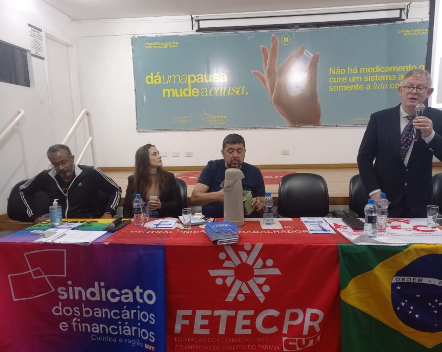 O presidente da Federação dos Trabalhadores em Empresas de Crédito do Paraná (Fetec-CUT/PR), Deonisio Schmidt, fez sua fala de...