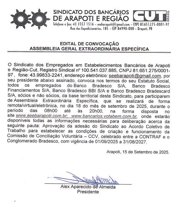 O Sindicato de Arapoti vai realizar na quinta-feira (18/09), Assembleia Extraordinária Específica das funcionárias e funcionários do Bradesco para deliberar a respeito da adesão da entidade ao ACT (Acordo Coletivo de Trabalho), firmado entre o banco e a Contraf-CUT (Confederação Nacional dos Trabalhadores do Ramo Financeiro) para estabelecer as condições de criação e funcionamento da CCV (Comissão de Conciliação Voluntária).