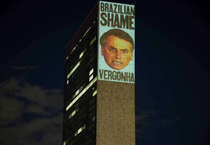 Uma projeção de foto do rosto do presidente Jair Bolsonaro (PL), com as palavras ‘Brazilian shame’ (vergonha brasileira), foi feita no prédio da Organização das Nações Unidas (ONU), em Nova Iorque, horas antes do discurso de Bolsonaro na abertura da 77ª Assembleia Geral da instituição.