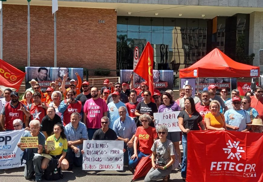 A Federação dos Trabalhadores em Empresas de Crédito do Paraná (Fetec-CUT-PR) participou nesta terça-feira (21) de um protesto em frente à sede do Banco Central em Curitiba. O ato, organizado pelas centrais sindicais, foi contra os juros altos da Selic e contra o presidente do Banco Central, Roberto Campos Neto.