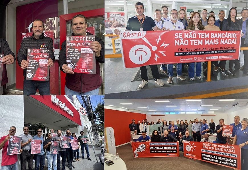 Nesta terça-feira (12), bancários de todo o Brasil participaram do Dia Nacional de Luta contra as demissões e o fechamento de agências do Bradesco. A mobilização, organizada pela Confederação Nacional dos Trabalhadores do Ramo Financeiro (Contraf-CUT) e pelas federações e sindicatos filiados, levou faixas, cartazes e mensagens de protesto às portas de diversas unidades do banco.