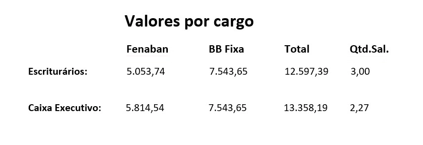 A PLR do banco é composta pelo módulo Fenaban e pelo módulo BB. Pelo módulo Fenaban, o funcionário recebe 45% do salário paradigma definido no acordo, acrescido de parcela fixa. No módulo BB existe ainda a distribuição linear de 4% do lucro do banco entre os funcionários, além da parcela variável. Veja abaixo a tabela: