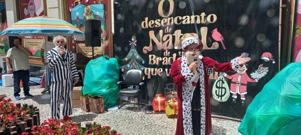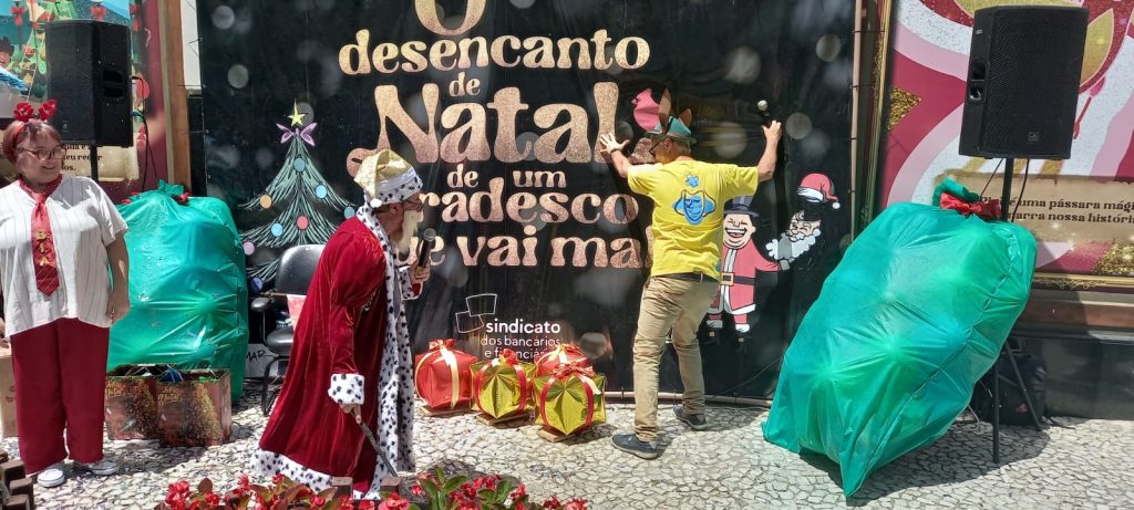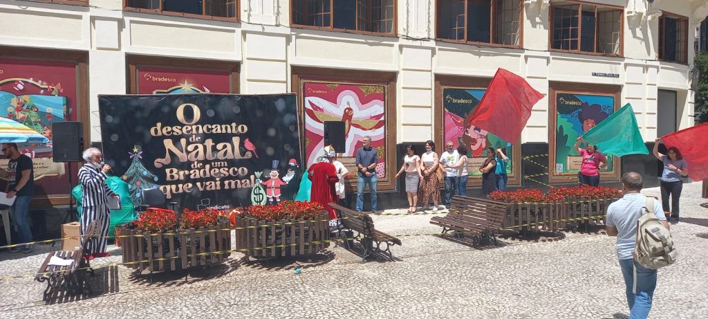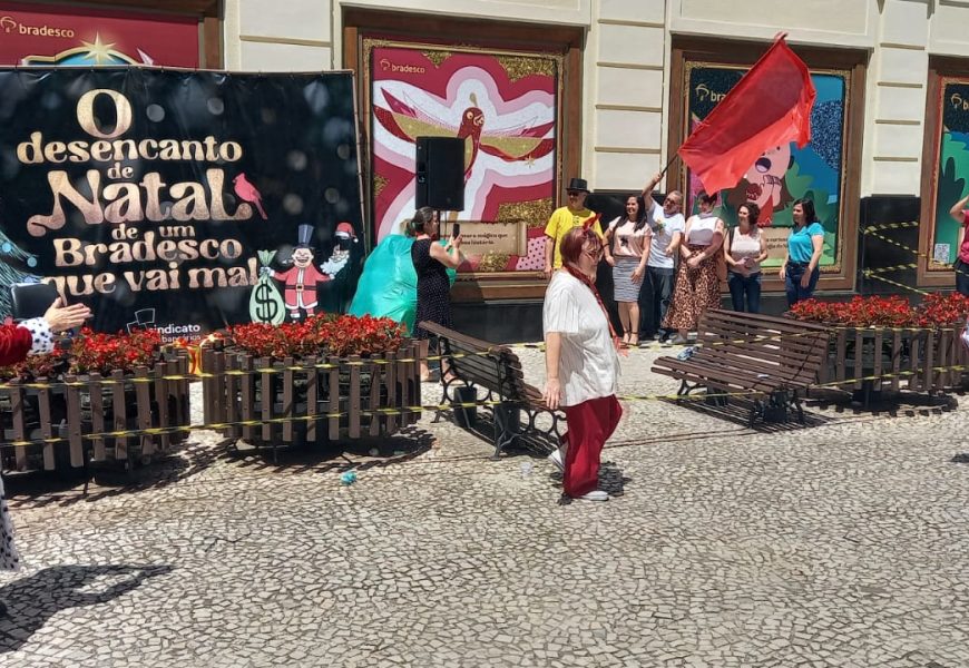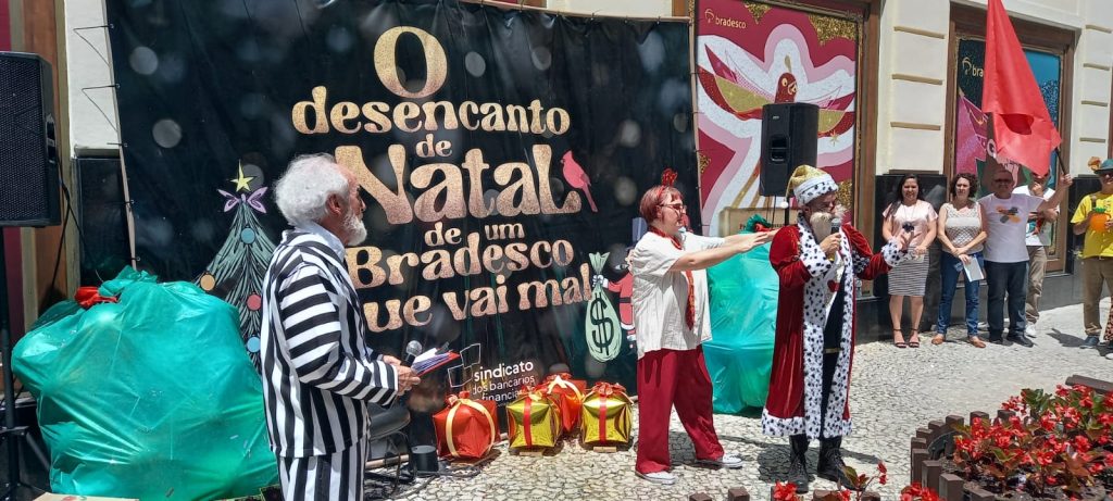 Este ano, o tema proposto pelo movimento sindical foi por meio de uma peça teatral chamada “O desencanto de Natal de um Bradesco que vai mal” e também com uma apresentação de coral. Os dois espetáculos mostraram para as pessoas que passavam pela Rua XV de Novembro um pouco do sofrimento das bancárias e bancários que trabalham no banco, que enfrentam assédio moral, péssimas condições de trabalho, entre outros.