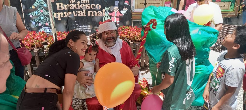 O Sindicato dos Bancários e Financiários de Curitiba e região e a Federação dos Trabalhadores em Empresas de Crédito do Paraná (Fetec-CUT/PR) promoveram nesta sexta-feira (15) a sua já tradicional sátira do Ato de Natal no Palácio Avenida, no Centro de Curitiba. Para as crianças que passavam pelo local, teve também um Papai Noel distribuindo doces.