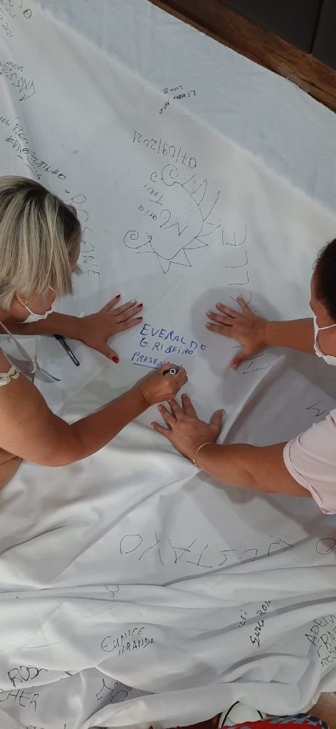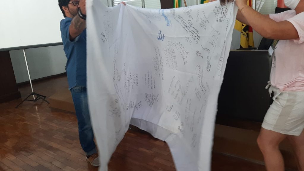 Ontem (24), durante uma mesa de saúde, um grupo do Rio Grande do Sul que fala sobre as vítimas de Covid-19, fez um memorial itinerante em que os participantes escreveram o nome de pessoas que morreram vítimas da doença em um lençol.