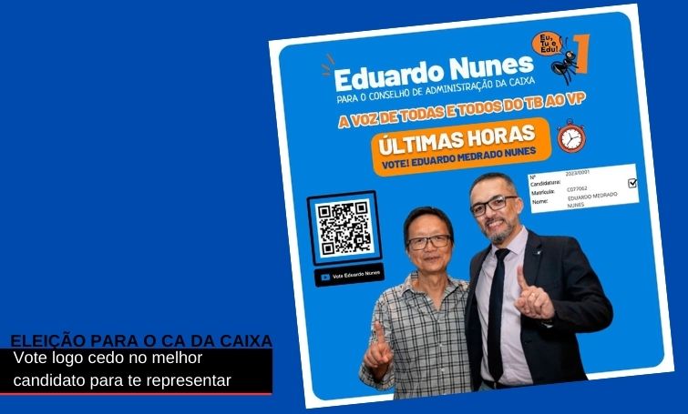 O segundo turno da eleição para a definição da representação das empregadas e empregados no Conselho de Administração da Caixa Econômica Federal termina hoje. Você tem até as 17h59 para votar no Eduardo Nunes e exercer o seu direito de ter o melhor candidato para representá-lo no mais alto escalão da Caixa. A Contraf-CUT e a maioria das entidades de representação e associativas das empregadas e empregados da Caixa orientam voto nele.