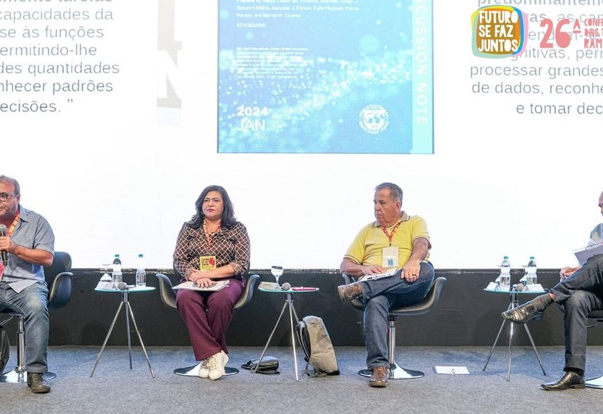 Dando continuidade à 26ª Conferência Nacional dos Trabalhadores do Ramo Financeiro (Contraf-CUT), a segunda mesa do dia trouxe uma conversa com o doutor em Ciências Políticas da Universidade de São Paulo (USP) e professor da Universidade Federal do ABC (UFABC), Sérgio Amadeu. O tema da mesa foi “Inteligência Artificial (IA) e seus impactos na vida, no emprego e na sociedade”.