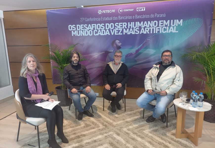 A mesa 1 da 27.ª Conferência Estadual dos Bancários e Bancárias do Paraná traz para o debate o tema do evento. Com a presença do professor e estrategista da Teia Digital, José Vital, a mesa conta também com a participação da jornalista Ana Caldas, do secretário-geral da Fetec Ewerton Luís Lopes e do secretário de formação da Fetec, Pablo Dias. De forma online, participa também o representante da Regional Pactu Wendrel Minare.