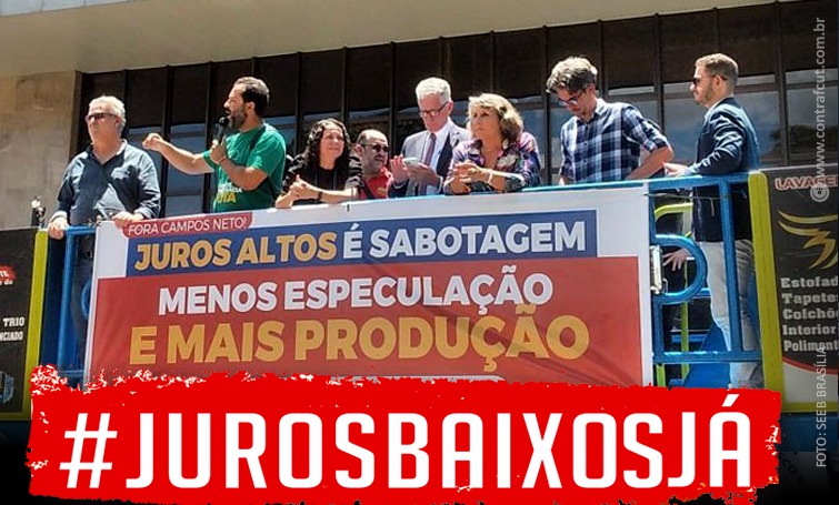 Nesta terça-feira (14), a categoria bancária realizou protestou em todo o Brasil contra os juros altos definidos pelo Banco Central (BC). A Selic, a taxa básica, está em 13,75%, a mais alta do mundo. As manifestações ocorreram em frente a todos os prédios do BC no Brasil e em locais de grande circulação em cidades onde a instituição não tem sede. Entre as 11 horas e o meio-dia de Brasília, também ocorreu um tuitaço, com a hashtag#JurosBaixosJá.