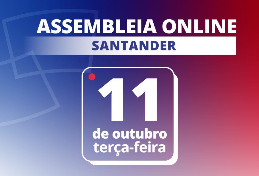 O Sindicato dos Bancários e Financiários de Curitiba e região convoca todos os funcionários e funcionárias do Santander de sua base para assembleia online específica, que será realizada das 08h00 às 20h00 do dia 11 de outubro, pela plataforma Vota Bem. Em pauta, as seguintes questões: 1) Qual a sua opinião sobre as terceirizações anunciadas pelo Banco Santander? 2) Você compreende que todos aqueles que prestam serviços em atividades que tenham como objetivo operações financeiras devam estar abrangidos pela representação dos Sindicatos dos Bancários? Participe para responder.