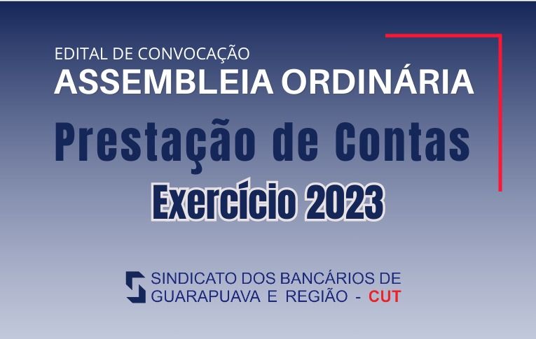 O Sindicato dos Empregados em Estabelecimentos Bancários de Guarapuava e Região, inscrito no CNPJ/MF sob o nº 78.279.734/0001-49, registro sindical nº MTB/313.690, por seu presidente abaixo assinado, convoca todos os bancários e bancárias associados à entidade dos municípios de sua base territorial, Guarapuava, Boa Ventura do São Roque, Campina do Simão, Candói, Cantagalo, Espigão Alto do Iguaçu, Foz do Jordão, Guamiranga, Goioxim, Inácio Martins, Laranjal, Laranjeiras do Sul, Manoel Ribas, Marquinho, Mato Rico, Nova Laranjeiras, Nova Tebas, Palmital, Pinhão, Pitanga, Porto Barreiro, Prudentópolis, Quedas do Iguaçu, Reserva do Iguaçu, Rio Bonito do Iguaçu, Santa Maria do Oeste, Turvo e Virmond, para Assembleia Geral Extraordinária que será realizada no dia 28 de maio de 2024, às 18:30 horas, na sala de reuniões do Sindicato, situado à Rua Capitão Frederico Virmond, 2563 – 1º andar – Centro – Guarapuava/PR.