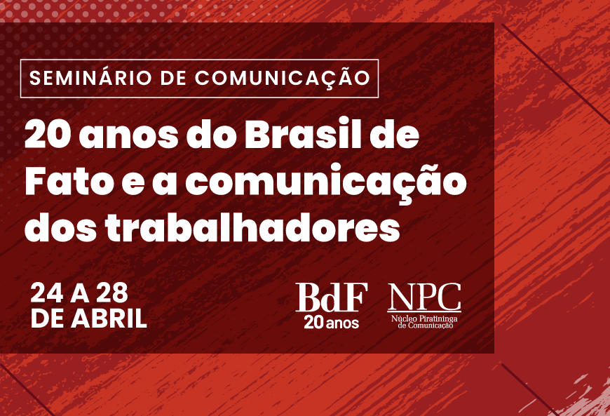 O Núcleo Piratininga de Comunicação (NPC) e o jornal Brasil de Fato-PR convidam para o seminário “20 anos do Brasil de Fato e a comunicação dos trabalhadores”, que será realizado de 24 a 28 de abril, no auditório do Espaço Cultural e Esportivo do Sindicato dos Bancários e Financiários de Curitiba e região (Rua Piquiri, 380 – Rebouças).