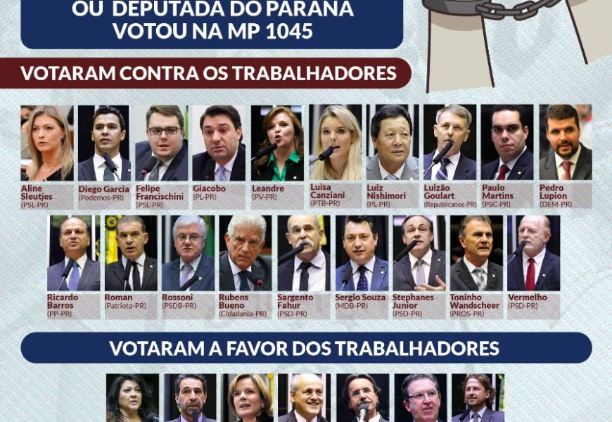 Essas reformas só foram possíveis por conta dos deputados federais que aprovaram este assalto contra os nossos direitos. Nos últimos anos, a maioria esmagadora dos representantes do Paraná na Câmara Federal tem atendido aos interesses do grande empresariado, do grande capital e contra os trabalhadores e, por consequência, contra o povo do Paraná. Abaixo, fizemos uma lista que mostra como os deputados federais pelo nosso Estado e que buscam a reeleição votaram. Dos 30 parlamentares, apenas quatro não irão tentar a reeleição (Aline Sleutjes (Pros), Paulo Martins (PL), Ney Leprevost (União Brasil) e Osmar Serraglio (PP)).